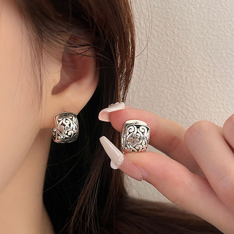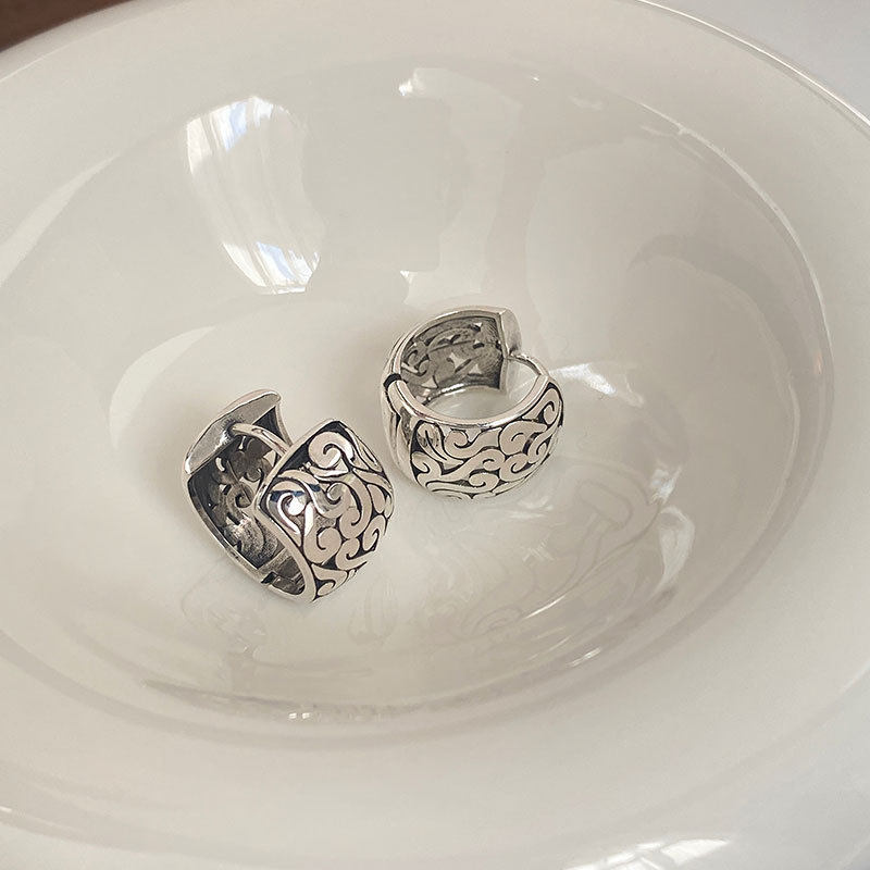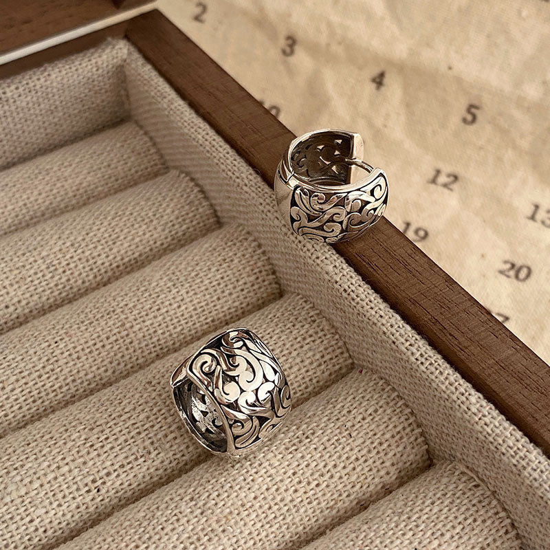Cloud Ear Buckle Tibetan Style Retro Old Thai Silver Tang Grass Pattern Earrings
